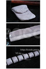 4、然后把面团擀成方形,卷成长条,用手搓成光滑均匀的长条;切件。